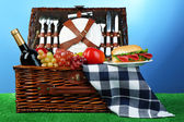 Wiklinowy kosz piknikowy z naczynia i obrusy na białym tle