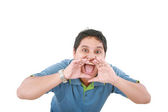 młody człowiek otworzył usta z niespodzianka, na białym tle na tył biały