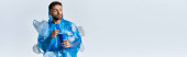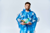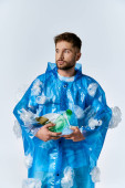 Zdjęcie "Człowiek na plastikowej górze z niebieskim kubkiem i torbą z tworzywa sztucznego." może być wykorzystywane do celów osobistych i komercyjnych zgodnie z warunkami zakupionej licencji Royalty-free. Obraz jest dostępny do pobrania w jakości wysokiej rozdzielczości do 5760x3840.