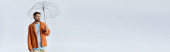 Mężczyzna w kurtce trzyma przezroczysty parasol na niebieskim tle.