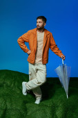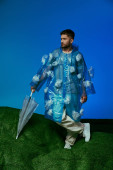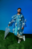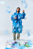 Zdjęcie "Mężczyzna leży na kawałku sztucznej trawy otoczony plastikowymi odpadami, pracując na laptopie.." może być wykorzystywane do celów osobistych i komercyjnych zgodnie z warunkami zakupionej licencji Royalty-free. Obraz jest dostępny do pobrania w jakości wysokiej rozdzielczości do 5760x3840.