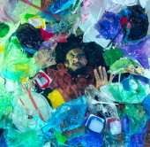 Człowiek siedzi pośród stosu plastikowych odpadów, wyciągając dłoń ku niebu..
