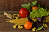 strąk surowy w kosz z pomidorami i czosnkiem