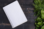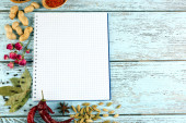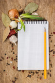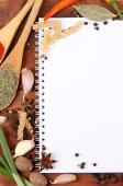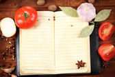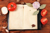 Otwórz książkę kucharską z świeżych ziół i przypraw na drewniane tła