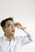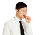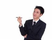 Młody biznesmen azjatyckich picia szklankę wody, na białym tle