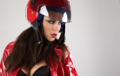 Sexy kobieta z motrcycle biały kask i zaskoczony expressio