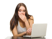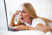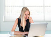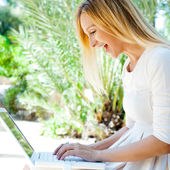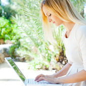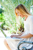 zrelaksowany piękna kobieta za pomocą laptopa siedząc na ławce w s