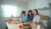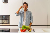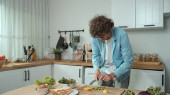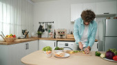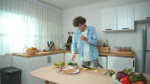Szczęśliwy ojciec przenieść się do muzyki podczas gotowania żywności i przygotować obiad w nowoczesnej kuchni. Aktywny tata tańczy do piosenki, robiąc zdrowe jedzenie lub sałatkę otoczoną warzywami i przyborami kuchennymi. Pedagogika.