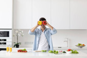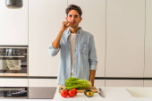 Zdjęcie "Szczęśliwy ojciec przenieść się do muzyki podczas gotowania żywności i przygotować obiad w nowoczesnej kuchni. Aktywny tata tańczy do piosenki, robiąc zdrowe jedzenie lub sałatkę otoczoną warzywami i przyborami kuchennymi. Pedagogika." może być wykorzystywane do celów osobistych i komercyjnych zgodnie z warunkami zakupionej licencji Royalty-free. Obraz jest dostępny do pobrania w jakości wysokiej rozdzielczości do 5760x3840.