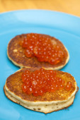 Sól pomarańczowa łososia w małej, trójkątnej niebieskiej misce