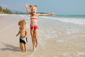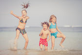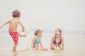 dwie siostry i brat gra na plaży