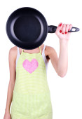 Szalona dziewczyna portret przytrzymanie na głowę garnek i patelnie