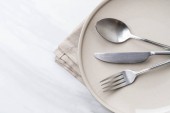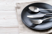 Stylowe sztućce i talerz na czarnym stole, widok z góry. Miejsce na tekst
