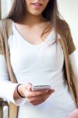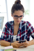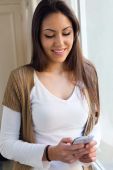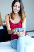 Piękna młoda kobieta w domu za pomocą jej telefon komórkowy.