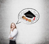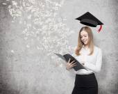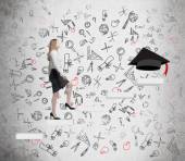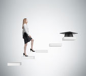 Młoda dama jest wspinaczka do dostać dyplom. Stos książek i graduacyjnej kapelusz jako nagrody.