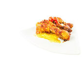 Malezyjski danie smażone kalmary z sambal pikantny sos chili ot scallion i pomidory na białym talerzu.
