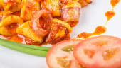 Malezyjski danie smażone kalmary z sambal pikantny sos chili ot scallion i pomidory na białym talerzu.