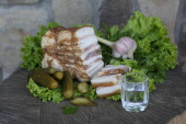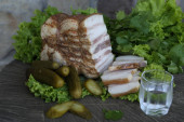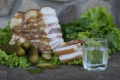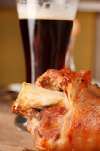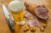 Piwo z pianką w przezroczysty kubek i wędzone mięso z tłuszczu l
