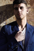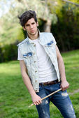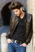 Przystojny mężczyzna młody niebieski oczy pozowanie w wielkomiejskim