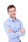 Uśmiechnięty mężczyzna moda młody siedzi ze skrzyżowanymi nogami
