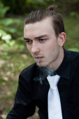 Hipster przystojny młody mężczyzna z papierosem zbliżenie na tle