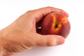 świeży soczysty smaczny czerwony i żółty brzoskwinia w ludzką ręką na białym tle