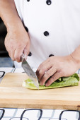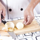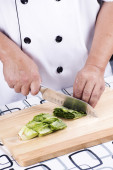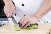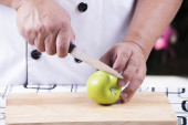szef kuchni cięcia ziemniaków na drewniane szeroko