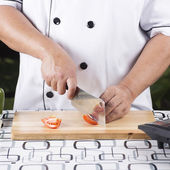 szef kuchni cięcia ziemniaków na drewniane szeroko