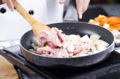 szef kuchni, kładąc przypraw sos na patelni do gotowania japoński por