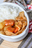 szef kuchni wprowadzenie mieszać smażone wieprzowina Japoński curry do puli