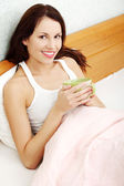 sypialnia - młoda kobieta wypić kawę w łóżku
