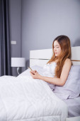 sypialnia - młoda kobieta wypić kawę w łóżku