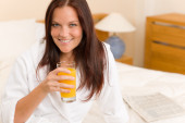 śniadanie - uśmiechający się ze świeżego soku pomarańczowego