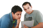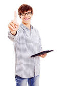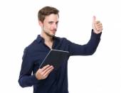 śmiejąc się dorywczo młody człowiek trzyma pewien dotknąć Podkładka tabliczka pc na isola