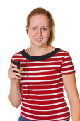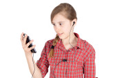 Uśmiechający się młoda dziewczyna z rękami wyciągniętymi słuchanie muzyki na jej telefon i taniec na białym tle
