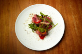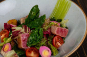 Sałatka z truskawek, szynka, zioła, twaróg i blackberry ocet balsamiczny.
