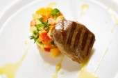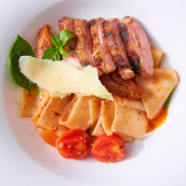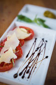 Sałatka z truskawek, szynka, zioła, twaróg i blackberry ocet balsamiczny.