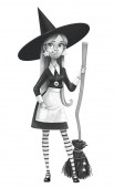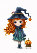 Cute kreskówki czerwony włosy czarownica dziewczyna z czarny kruk izolowane na białym tle