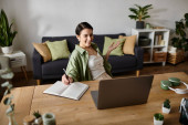 Piękna kobieta z bielactwo skupia się na swojej pracy podczas sączenia kawy.