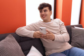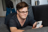 Młody człowiek z zespołem Downa wygodnie spędza czas ze smartfonem na kanapie.