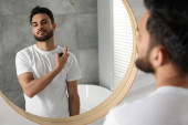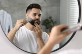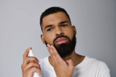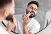 Zdjęcie "Mężczyzna starannie golenie przy jednoczesnym korzystaniu z cichej chwili w stylowej łazience." może być wykorzystywane do celów osobistych i komercyjnych zgodnie z warunkami zakupionej licencji Royalty-free. Obraz jest dostępny do pobrania w jakości wysokiej rozdzielczości do 5760x3840.
