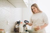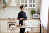 Szczęśliwa kobieta ciesząca się zmywaniem w ciepłym, zapraszającym do domu.
