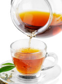 herbata jest wlewany do filiżanki herbaty na białym tle na białym tle