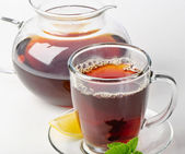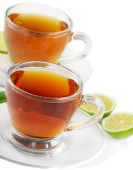 herbata jest wlewany do filiżanki herbaty na białym tle na białym tle
