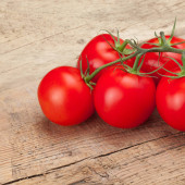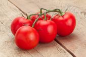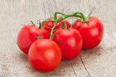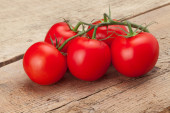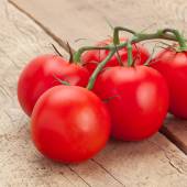 Kilka czerwonych pomidorów na prosty drewniany stół