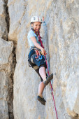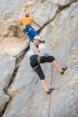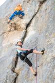Kobieta wspinaczka przechodzi trudne utwory na skale