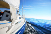 Zdjęcie "jacht katamaran. Błękitny ocean spokojny i bezchmurne niebo niebieskie są w tle" może być wykorzystywane do celów osobistych i komercyjnych zgodnie z warunkami zakupionej licencji Royalty-free. Obraz jest dostępny do pobrania w jakości wysokiej rozdzielczości do 5760x3840.
