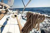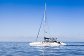 jacht katamaran. Błękitny ocean spokojny i bezchmurne niebo niebieskie są w tle