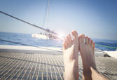 mężczyzna wyleguje się na trampolinie jacht katamaran z jej nogi podparte i przekroczył.