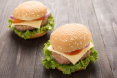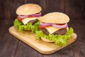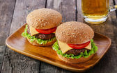 BBQ hamburger z frytkami i piwo na drewniane deseń